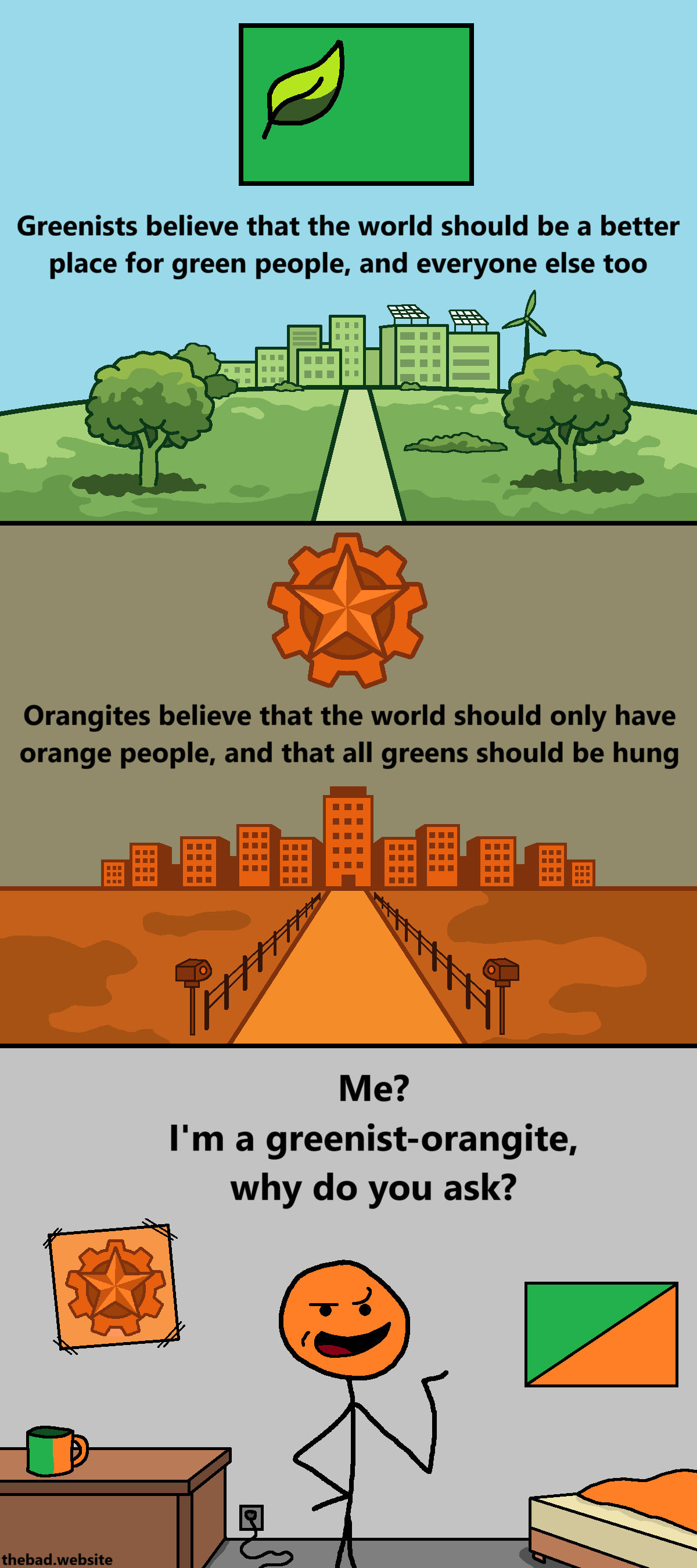 Orangites believe that the world should only have orange people, and that all greens should be hung