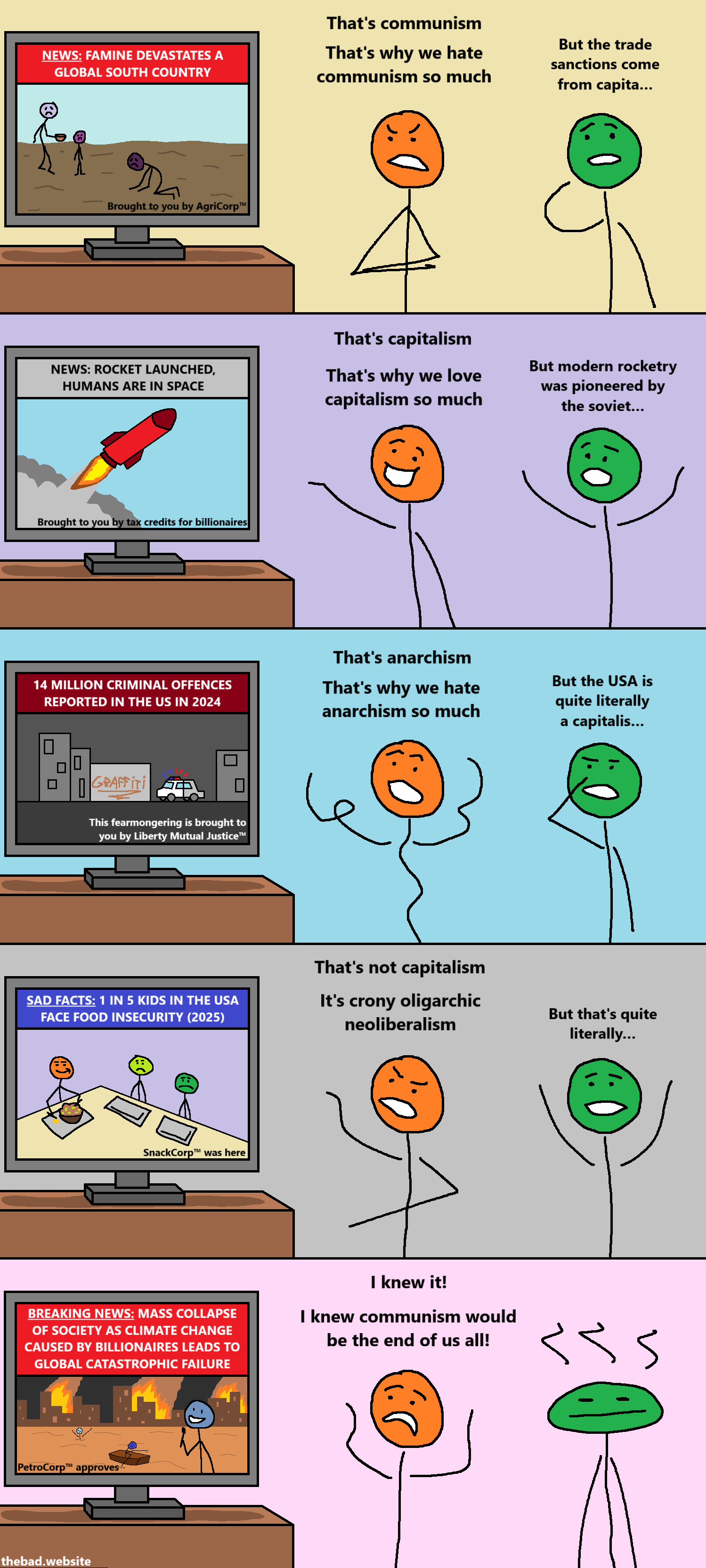 [A television shows a reporter reporting on the end of the world with the title "BREAKING NEWS: MASS COLLAPSE OF SOCIETY AS CLIMATE CHANGE CAUSED BY BILLIONAIRES LEADS TO GLOBAL CATASTROPHIC FAILURE" and the subtitle "PetroCorp™ approves"]